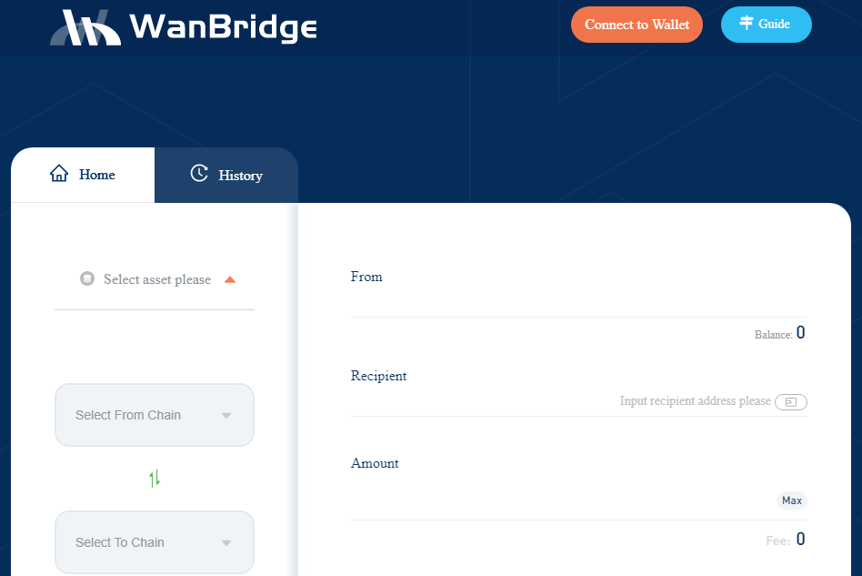 Before completing decentralized crosschain transactions using WanBridge Web, you need to ensure you have access to the correct wallet(s). You must have wallets for each network involved in the crosschain transaction. In other words, if you are moving $BTC from Bitcoin to Ethereum, you need to use Bitcoin and Ethereum wallets. Similarly, if you are moving $LTC from Wanchain to Moonriver, you need Wanchain- and Moonriver-compatible wallets. Click “Select asset please” on the left side of the terminal. Select the asset you want to move crosschain from one blockchain network to another. Click “Select From Chain” and select the origin chain. Click “Select To Chain” and select the destination chain. Click “Connect to Wallet” in the top right corner of the window. When connecting Metamask for the first time, you will need to click connect in the Metamask pop-up window. Your Ethereum wallet address will now be connected to WanBridge Web. Your ETH balance should also be visible.