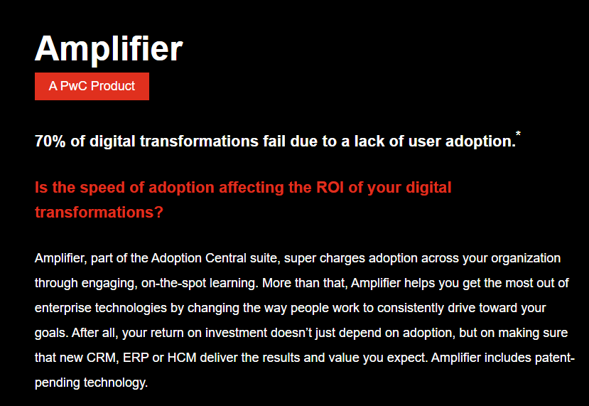 Amplifier, part of the Adoption Central suite, super charges adoption across your organization through engaging, on-the-spot learning. More than that, Amplifier helps you get the most out of enterprise technologies by changing the way people work to consistently drive toward your goals. After all, your return on investment doesn’t just depend on adoption, but on making sure that new CRM, ERP or HCM deliver the results and value you expect. Amplifier includes patent-pending technology. Adoption Central is a continuous adoption suite that gives you one consistent, engaging way to learn across all of the enterprise systems in your organization, now and in the future. That means you don’t have to reinvent the wheel every time you introduce something new into your ecosystem. It means you spend less time and money getting your people up to speed on new tools and more time seeing results.