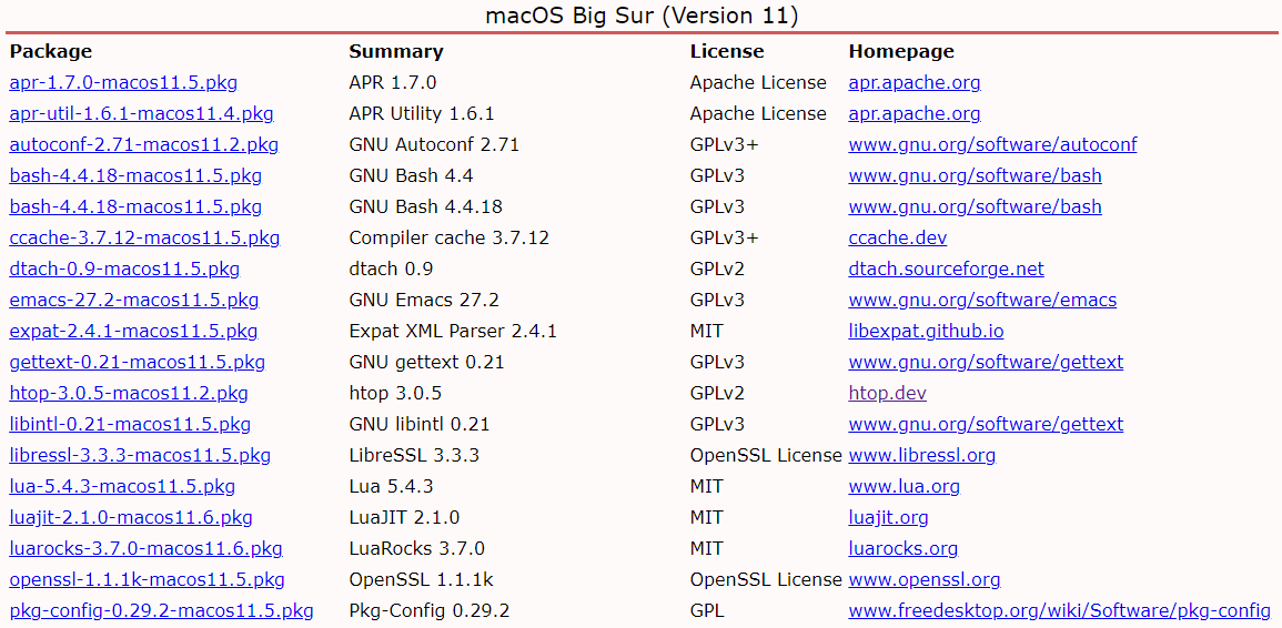 Rudix is a build system target on macOS (formerly known as Mac OS X) with minor support to OpenBSD, FreeBSD, NetBSD, and Linux. The build system (also called "ports") provides step-by-step instructions for building third-party software, entirely from source code. Rudix provides more than a pure ports framework, it comes with packages, and precompiled software bundled up in a nice format (files *.pkg) for easy installation on your Mac. If you want to collaborate on the project, visit us at GitHub/rudix-mac or at our mirror at GitLab/rudix. Use the GitHub issue tracker to submit bugs or request features. Similar projects or alternatives to Rudix are Fink, MacPorts, pkgsrc, and Homebrew. Packages are compiled and tested on macOS Big Sur (Version 11, Intel only!), Catalina (Version 10.15) and OS X El Capitan (Version 10.11). Every package is self-contained and has everything it needs to work. The binaries, libraries, and documentation will be installed under /usr/local/.