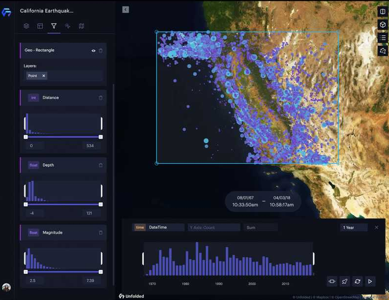 Transform your geospatial data into insightful maps within minutes. Use our extensive layer catalog and advanced timeline animation capabilities. Slice and dice your data using our intuitive geospatial analytic capabilities. Quickly arrive at insights through fluid in-browser exploration with immediate visual feedback. Publish your maps to your team with the click of a button. Make your own stories and share impactful data narratives with the world. An intuitive user experience that makes complex geospatial data science easy. Combine Shapefiles, Vector Tiles and Cloud-Optimized GeoTIFFs with traditional data formats like CSV and GeoJSON. Analyze your data by joining tables and grouping rows. Cross-filter data and correlate columns using custom metrics. Build polished web applications on top of your published maps. Iterate quickly with our well-documented and easy-to-use API. Perform geospatial joins across different geospatial data types.