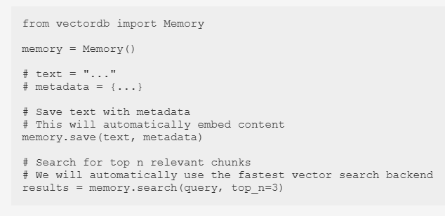 VectorDB is a lightweight Python package for storing and retrieving text using chunking, embedding, and vector search techniques. It provides an easy-to-use interface for saving, searching, and managing textual data with associated metadata and is designed for use cases where low latency is essential. Vector search and embeddings are essential when working with large language models because they enable efficient and accurate retrieval of relevant information from massive datasets. By converting text into high-dimensional vectors, these techniques allow for quick comparisons and searches, even when dealing with millions of documents. This makes it possible to find the most relevant results in a fraction of the time it would take using traditional text-based search methods. Additionally, embeddings capture the semantic meaning of the text, which helps improve the quality of the search results and enables more advanced natural language processing tasks.