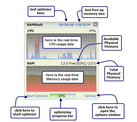 RAMRush is a free memory management and optimization tool. It can efficiently optimize the memory usage of your Windows system, free up physical RAM and make your system work better. RAMRush uses an intelligent way to manage the physical memory and lets the RAM work with a better performance. It will help you to prevent system crashes, and memory leaks and keep your computer running more efficiently. RAMRush is easy and powerful to use for both beginners and experts. No experience or computer skills are necessary! RAMRush is freeware, you could download and use it free of charge. 100% clean! No spyware or adware! Increase system performance. Increase the amount of memory available. Defragment system physical memory. Recover memory from Windows applications. Remove memory leaks. Prevent system crashes caused by memory problems. Display the real-time usages data of CPU and RAM.