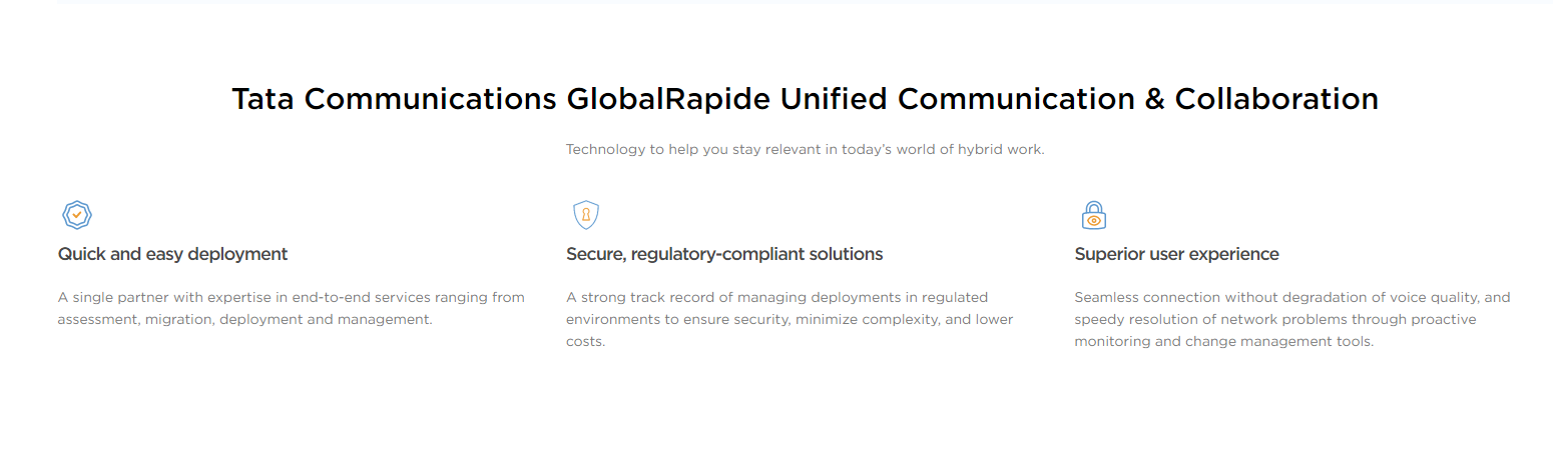 Grow your business, boost productivity and maximize efficiencies all at the same time with our comprehensive portfolio of unified communications and collaboration (UCC) solutions that seamlessly integrate with your existing systems while transforming your user experience. Our unified communications solutions allow you to easily connect, communicate and collaborate with employees and customers worldwide over video, web or audio conferencing. Radically improve customer experience and end-user loyalty using omni-channel cloud contact centre solutions with Tata Communications’ unified communications services. Improve efficiency and lower telephony costs across your business by unifying conferencing and leveraging Global SIP Trunking for IP telephony and video calling.” Seamlessly improve collaboration and productivity across audio, web or video (Unified Communications), while at the same time boosting productivity across your customers’ infrastructures.
