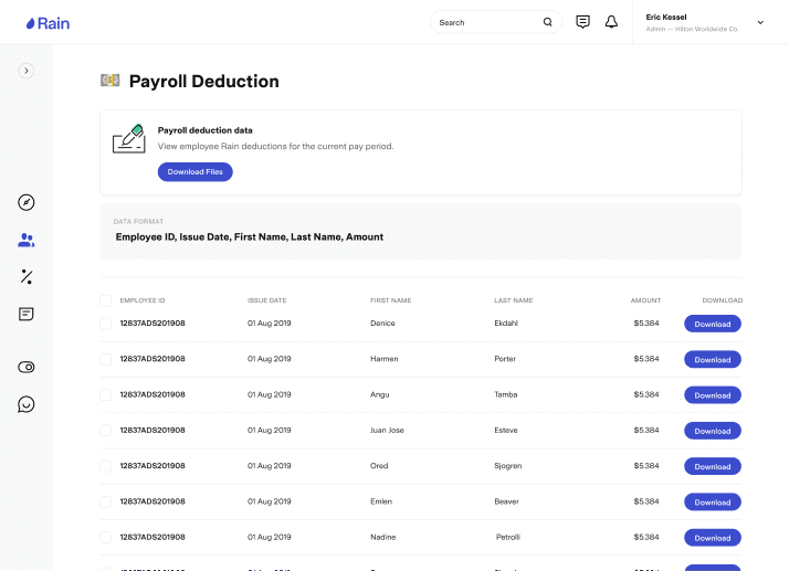 It's easy to set up and it doesn't cost your business anything extra. Don't live in the past, use Rain - the now way to pay! Fees for payday loans, credit cards, overdrafts, and low balances add up. 72% of Americans who are living paycheck-to-paycheck could benefit from early wage access. We offer our service free to employers who offer Rain to their people as a voluntary financial wellness benefit. Rain easily integrates with most payroll systems; your payroll team will not need to spend extra time or resources managing Rain. Zero fees & zero hassle for your payroll team. Through the Rain smartphone app, your people can access up to half of their earned-wage on-demand anytime. Each time an employee withdraws her/his earned-wage through the Rain app, we charge a small fee similar to an ATM fee. Ask us about our new zero-fee option.
