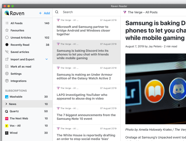 Raven is a open source desktop news reader with flexible settings to optimize your experience. No login is required, and no personal data is collected. Just select the websites you want to curate articles from and enjoy. Raven strips away all the distracting content from the original articles, annoying ads, banners, and awkward layouts. You control how Raven displays the content. Choose a theme you love. Customize your fonts and display size. Configure your layout and hide what you don’t need. Save the articles you like for offline reading to enjoy whether you’re up in the Himalayas or in an underground train. Some companies track the content you’re viewing so they can try to sell you more stuff. That’s not cool, we respect your privacy. Group your feeds and diverse interests by category. Create as many as you want. Social sharing, email, and read-it-later options so you and your network never miss out.