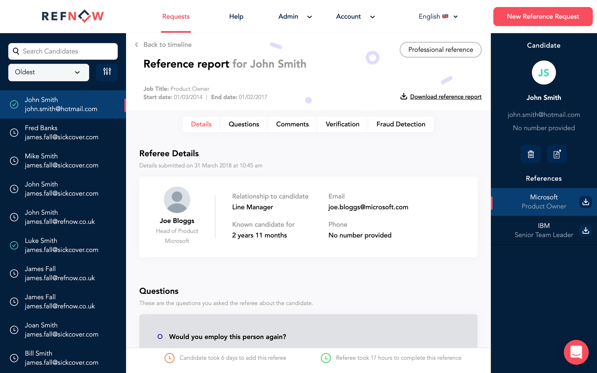 RefNow is trusted by businesses globally for collecting detailed employment references on candidates using automated GDPR compliant feedback. Empower your team to collect references faster and make decisions using better informed data on your prospective candidates.
