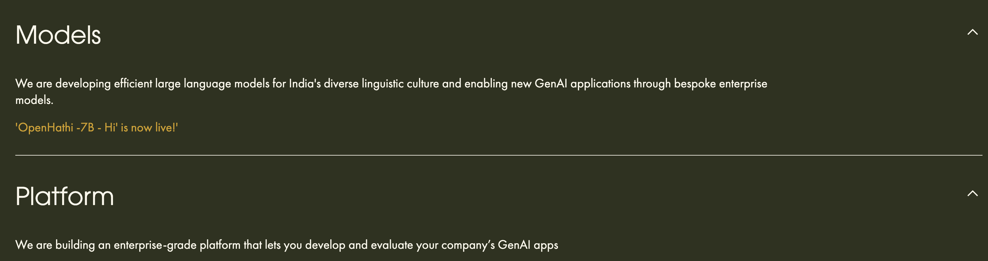 We are developing efficient large language models for India's diverse linguistic culture and enabling new GenAI applications through bespoke enterprise models. We are building an enterprise-grade platform that lets you develop and evaluate your company’s GenAI apps. We believe in the power of open-source to accelerate AI innovation and will be contributing to open-source models and datasets, as well be leading efforts for large-scale data curation in public-good space. We are a dynamic and close-knit team of AI pioneers, blending expertise in research, engineering, product design, and business operations. Our diverse backgrounds unite under a shared commitment to excellence in science and the creation of societal impact. We foster an environment where tackling complex tech challenges is not just a job, but a passion.