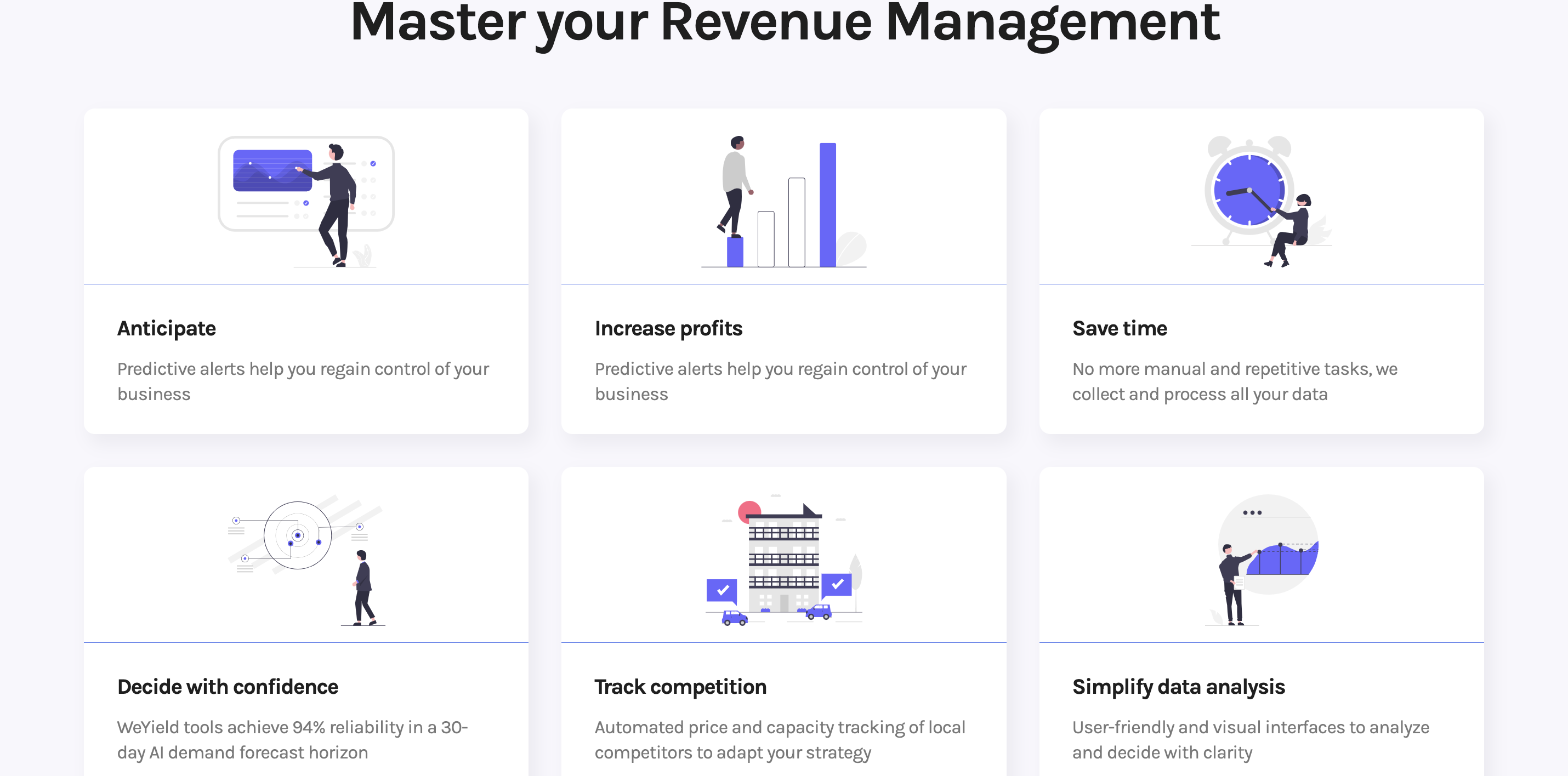 An experienced revenue Manager as a Coach is dedicated to your onboarding, training and success. Predictive alerts help you regain control of your business. Predictive alerts help you regain control of your business. No more manual and repetitive tasks, we collect and process all your data. WeYield tools achieve 94% reliability in a 30-day AI demand forecast horizon. Automated price and capacity tracking of local competitors to adapt your strategy. User-friendly and visual interfaces to analyze and decide with clarity. Unlimited access to the WeYield academy and training materials. Constant innovation and improvement of our management modules with your feedback. A community of Revenue Managers from all around the Globe.