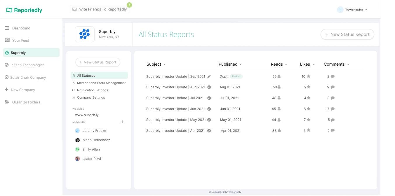 Use one platform to communicate with all your investors, see who is engaging with your updates, and reach out for help by using public and private status updates. Make your status updates as impactful as possible with reminder emails, investor templates, image uploads, and Markdown support. Share your company's story from the start - historical statuses and your team's feedback automatically shared with all members. See every status report from every company you work with all on one platform. Stay up to date with a single chronological view of your portfolio's status updates in the Reportedly feed. Offer help and guidance by sharing comments and liking company updates.