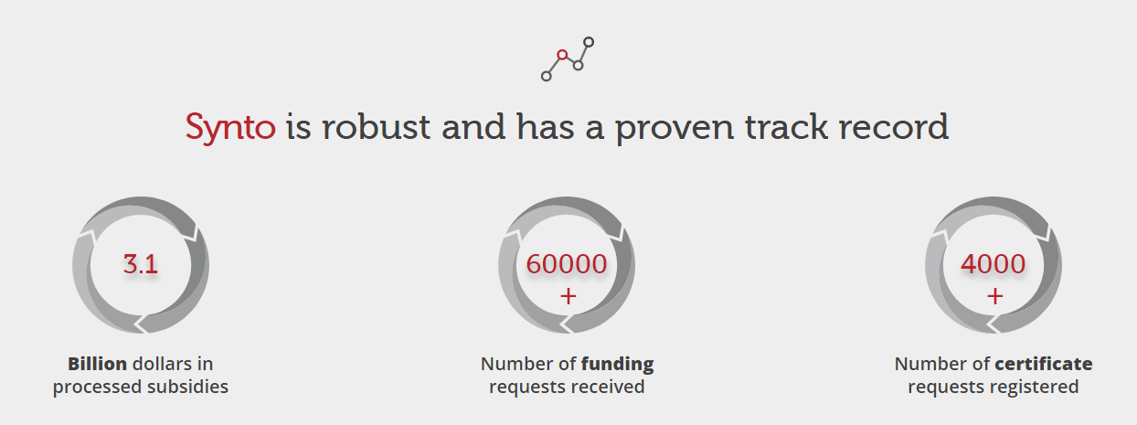 Synto is our promise to synthesize governance’s best practices and optimized performance, in processing funding applications and compliance management. Synto puts AI to work on enabling performance monitoring and introduces the predictive trend analysis to help decision makers.