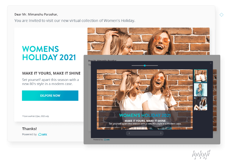 WFX Virtual Showroom showcase collections to buyers using innovative tools and presentations that enhance the buying experience and boost sales. Collaborate with teams on designs to create seasonal and customer oriented products. Integrate with design tools and 3D software to showcase designs in 3D and 2D. Use templates to create beautifully designed Digital Showrooms in through WFX Virtual Fashion Showroom Software. Customize the information you want to share with customers. Launch promotional campaigns to digitally showcase your collections on virtual fashion showroom. Invite customers via a secured link to your Virtual Fashion Showroom and drive inquiries and sales. Get instant design feedback from customers and iterate with them using in-built collaboration tools on a B2B virtual sales platform.