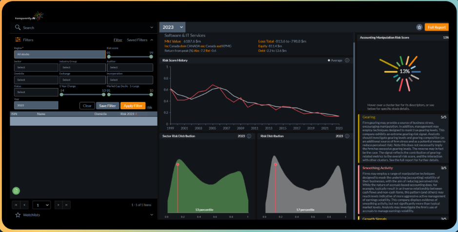 Built for financial analysts, portfolio managers, and regulators, our AI provides highly accurate accounting risk scores for tens of thousands of organizations across the globe. It can identify corporate accounting manipulation years ahead of the market and within seconds. The world’s first AI solution for early detection of accounting manipulation and fraud. The sooner you can identify a company’s financial “red flags”, the better. Unfortunately, it can take financial analysts months to analyze one company, as businesses hide their wrongdoings well. We built our own AI system to shine a light on corporate accounting malfeasance and empower financial experts to make more informed investments. It delivers an accurate 0-100 percentage score, as well as a custom report with detailed next-step recommendations. Our AI algorithms are our own one-of-a-kind creation, not an off-the-shelf solution with limited scope for improvement; this means you benefit from all future features.