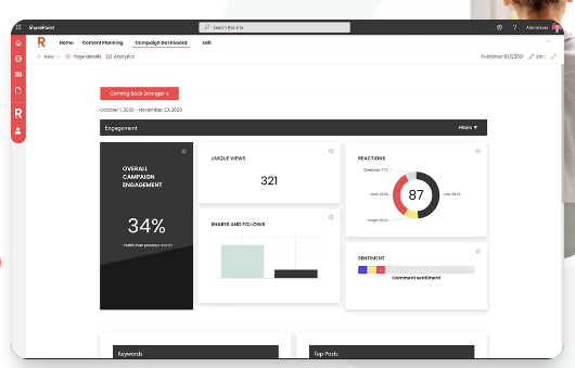 Ripple makes it easy to connect with your employees. Understand what they love reading about most and how best to promote your campaigns. Intuitive tools integrated with SharePoint allow you to create stunning, branded content to connect and engage. Intuitive, visual workflow tools that suit the way you work, and a drag-and-drop calendar that gives you the power to schedule a pinpoint-accurate comms plan. Ripple is the only internal comms tool that gives you in-depth insights, directly from your internal hub. Learn from people’s reactions, and refine your communications based on a vast array of metrics. Embed SharePoint and M365 tools into your campaigns with ease. Streamline your working processes and give your audience the joy of rich, relevant content with every campaign. With in-built branding tools, build eye-catching posts that ensure your message lands every time. Group them into campaign themes and easily integrate rich content from across your M365 platform.