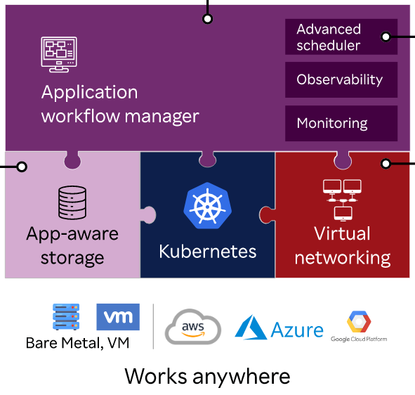 Hyper-converged Kubernetes is a software-defined application orchestration framework that combines containerized storage, networking, compute (Kubernetes), and the application management layer into a single system. Our approach extends Kubernetes for data-intensive applications such as Hortonworks, Cloudera, Elastic stack, RDBMS, NoSQL databases, and AI/ML apps. Facilitates simpler and faster roll-out of critical Enterprise IT and LoB initiatives, such as containerization, cloud-migration, cost-consolidation, and productivity improvement. Solves the fundamental challenges of running big data and databases in Kubernetes.