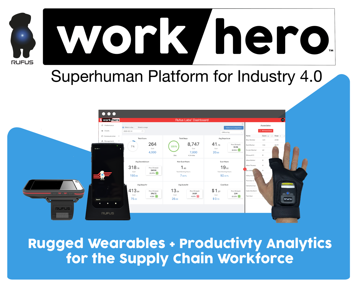 Rufus WorkHero is the most advanced connected operator platform for supply chain. Comprised of workforce analytics software, rugged wearable technology, and superhuman support, WorkHero is a complete Productivity as a Service solution for the evolving supply chain (Industry 4.0). WorkHero is compatible with most WMS systems and replaces existing scanning technology (with $0 Cap Ex), reduces pick speed/labor cost by up to 60%, and gives a never-before-seen level of worker visibility in our Fortune 500 customers’ warehouse operations with our WorkHero Dashboard. Refine workflow, lower costs and reduce liabilities through centralized metrics reporting. Rufus WorkHero Dashboard tracks items like pick rate, tasks completed, labor cost, activity levels and more. Improve workforce communication with group or one-to-one messaging. Seamless integration with existing workflow. Works on-site and off-site. No more walkies, emails, or text messages. Keep workers safe during the pandemic.