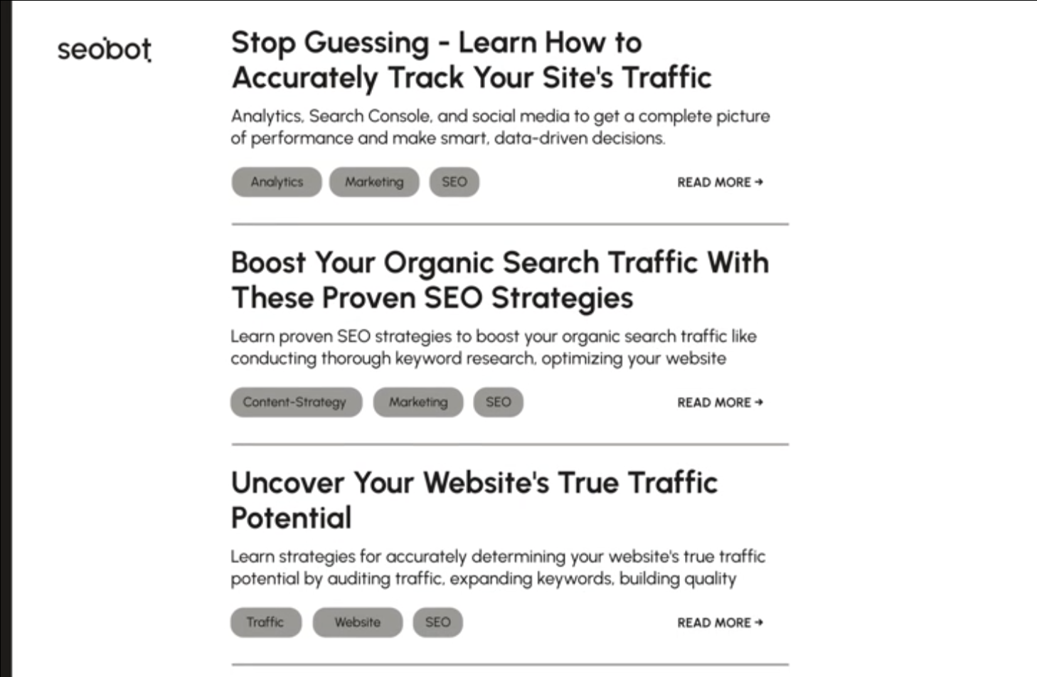 SEObot (aka SEO robot) expertly analyzes keywords from Google, targeting the most relevant ones for maximum impact. Not only can SEObot optimize existing articles based on traffic analysis, but it can also create new content that ranks highly in search results. Focus on what matters most while SEObot takes care of driving organic traffic from Google. Perfect for busy makers who want results with minimal hassle. The quality gets better every day. AI will measure the performance of all articles, kill the bad ones, and double down on good ones. If you want you can assist it, give it ideas, or take control, but by default, it runs 100% autopilot.