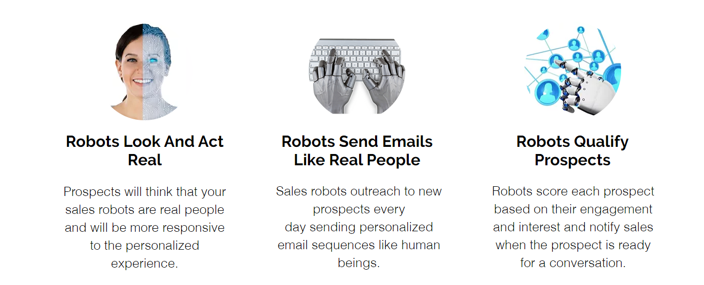 Software to help you create and manage a team of artificially intelligent sales robots. Build a team of sales robots that can send emails, qualify prospects, and accelerate your sales pipeline. Sales Innovator is a sales robot platform that allows companies to build a team of artificially intelligent sales robots to help accelerate outbound and inbound sales goals. Scale an infinite team of Artificial Intelligent (A.I.) sales robots who can send emails, qualify prospects, and help you accelerate your sales pipeline. Robots can be the first point of contact to engage prospects who recently requested contact online; e.g. low-scoring leads, partner referrals. Robots can be the second point of contact (after your sales rep attempted outreach) for prospects who previously showed high levels of interest. Robots can proactively initiate contact with prospects who previously expressed interest; e.g. untouched, unresponsive for more than 90 days, or closed/lost.