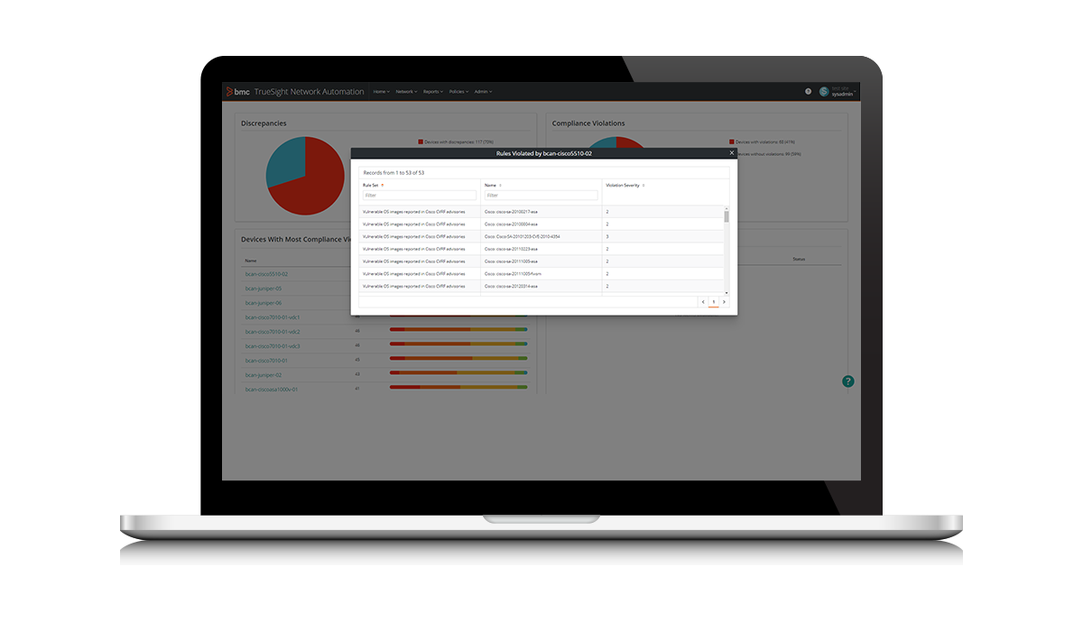 Network configuration and automation for better agility, security, and efficiency. Includes automated vulnerability management to analyze vulnerabilities, enhance visibility, and respond to threats across network devices. Leverage integration with vendor and NIST National Vulnerability DB security notifications to identify vulnerabilities, remediate device images, and upgrade devices with zero downtime. Drive fast configuration changes across thousands of network devices with automated roll-back and change tracking. Control device access to view or change settings, deploy pre-configured policies for regulatory standards such as CIS and DISA and remediate non-compliance. Deploy new physical or virtual network devices rapidly with gold-standard configurations to respond to business needs. Browse real-time device configurations to troubleshoot, view status of jobs, or complete a compliance audit.