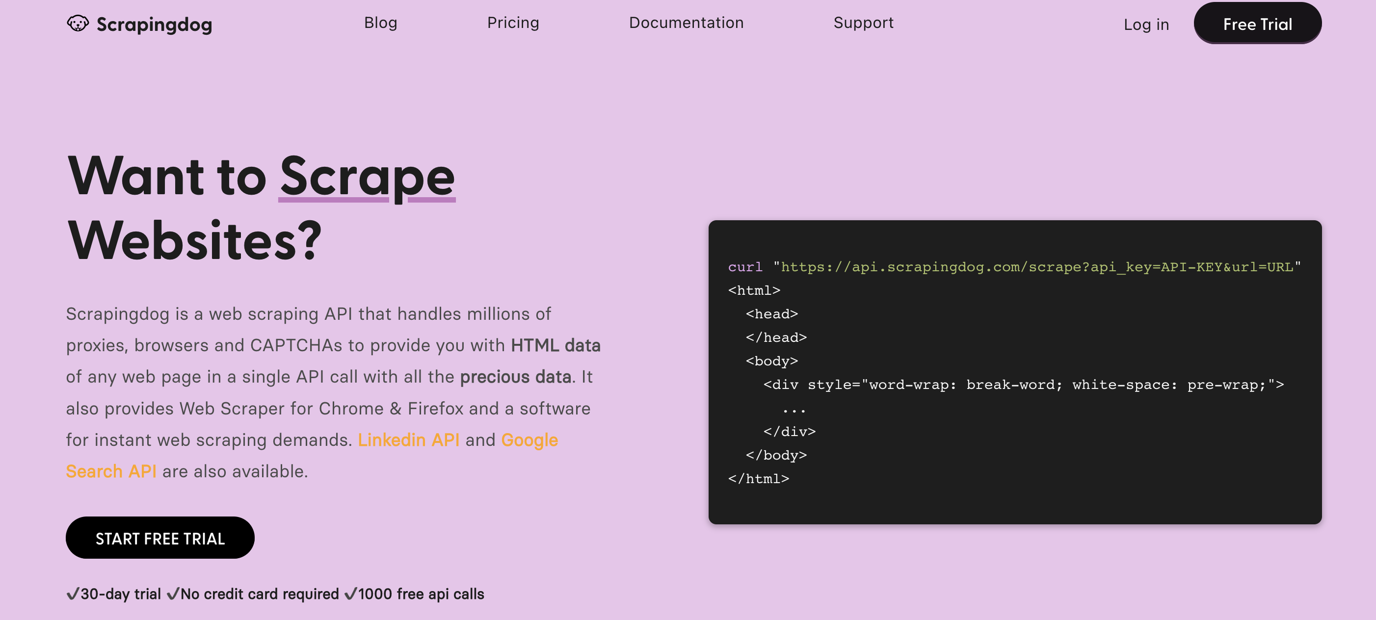 Scrapingdog is a web scraping API that handles millions of proxies, browsers and CAPTCHAs to provide you with HTML data of any web page in a single API call with all the precious data. It also provides Web Scraper for Chrome & Firefox and a software for instant web scraping demands. Linkedin API and Google Search API are also available. Scrapingdog rotates IP address with each request from a list of million of proxies. It also bypass every CAPTCHA so you can get the data you need. Your web scraping journey will never see a stop sign. Push website urls as required and receive crawled data to your desired webhook endpoint.We handle all queues and schedulers for you. Just call the asynchronous API and start getting scraping data. We use the Chrome browser in headerless mode so that you can render any page as it does in a real browser. You don't even have to pass any additional headers within the web scraping API. Our web scraper will use latest Chrome driver to scrape web pages.
