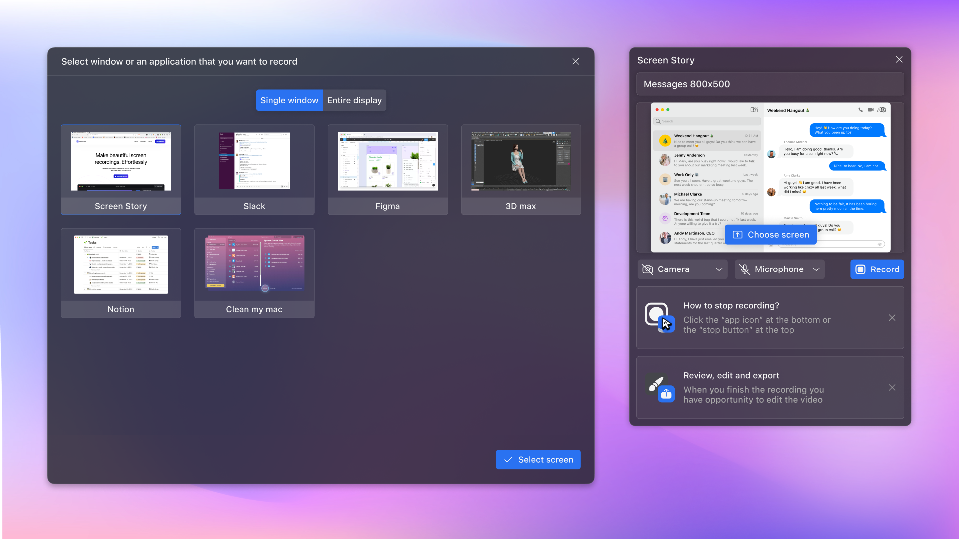 Make beautiful screen recordings, effortlessly. The easiest way to create video demos, tutorials, education videos, gifs, and promo videos for product hunt. Used by individual contributors and awesome companies. Create high-quality videos, no video editing skills needed. You don't need to edit videos manually, the tool automatically applies magic to your videos. Get a handcraft studio quality feel of the animation of the cursor automatically. Newton's physics applied. Screen story automatically creates AutoZooms animations on the part of your video recording. That saves you tons of time and the video looks more engaging. Apply motion blur to your animations, making the video feel more smooth. Choose from a variety of backgrounds, to match your brand guidelines and stand our from the crowd. Record screen and choose between a variety of export options. Gif, mp4, 60 FPS, 4K. Delete your cursor completely from the video. Or change your cursor type and use Screen Story for the mobile demo.