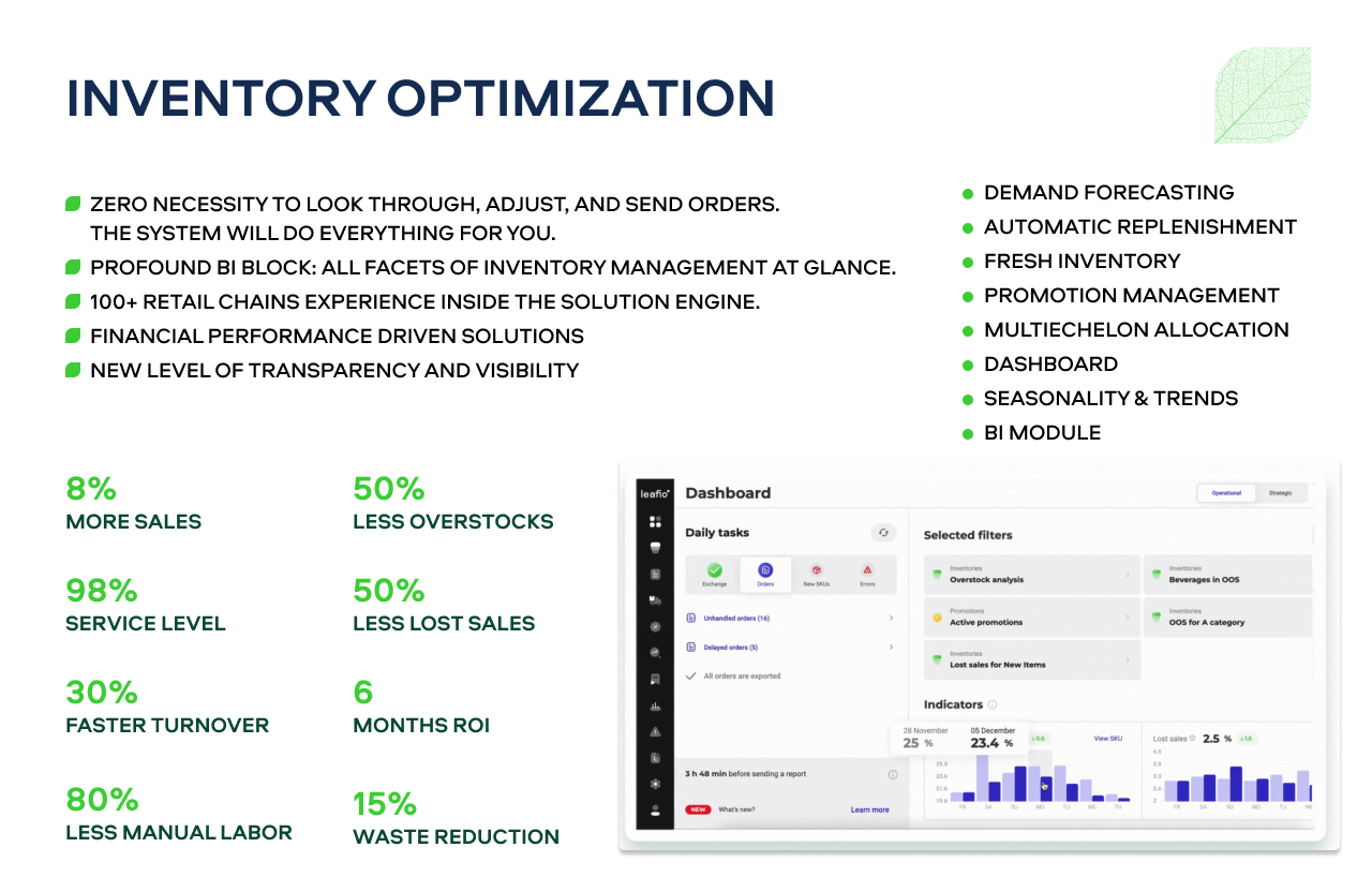 LEAFIO is designed to autonomously execute demand-driven replenishment in an environment of low predictability and constant change. Self-regulating algorithms guarantee sales, margin and turnover increase, inventories optimization, and time-saving due to demand satisfaction. Your trusted advisor in complex retail promotion planning, coordination, and execution.