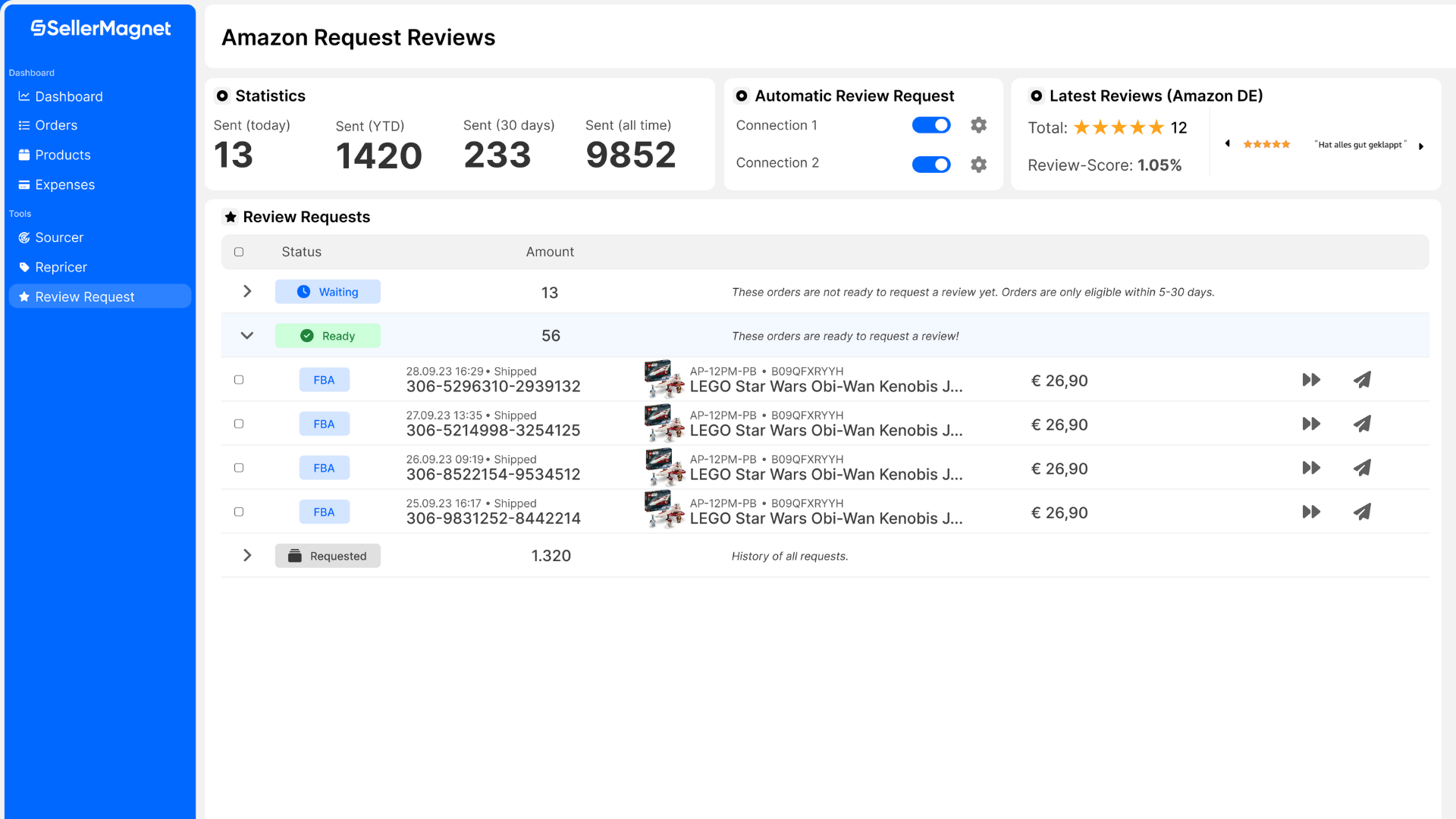SellerMagnet offers a 5-minute repricing engine with customizable rules and detailed logs for price changes, BuyBox status, and more. The product sourcer helps evaluate profitability, fees and competition directly from Amazon pages. The profit dashboard includes real-time inventory tracking across marketplaces, orders, return data and margin analysis. Review requests are automated and compliant with Amazon guidelines. The listing optimizer provides a quality score and SEO suggestions for titles, bullet points and keywords. The alert system notifies you about BuyBox losses, listing edits, hijacking attempts, price shifts and stock changes.