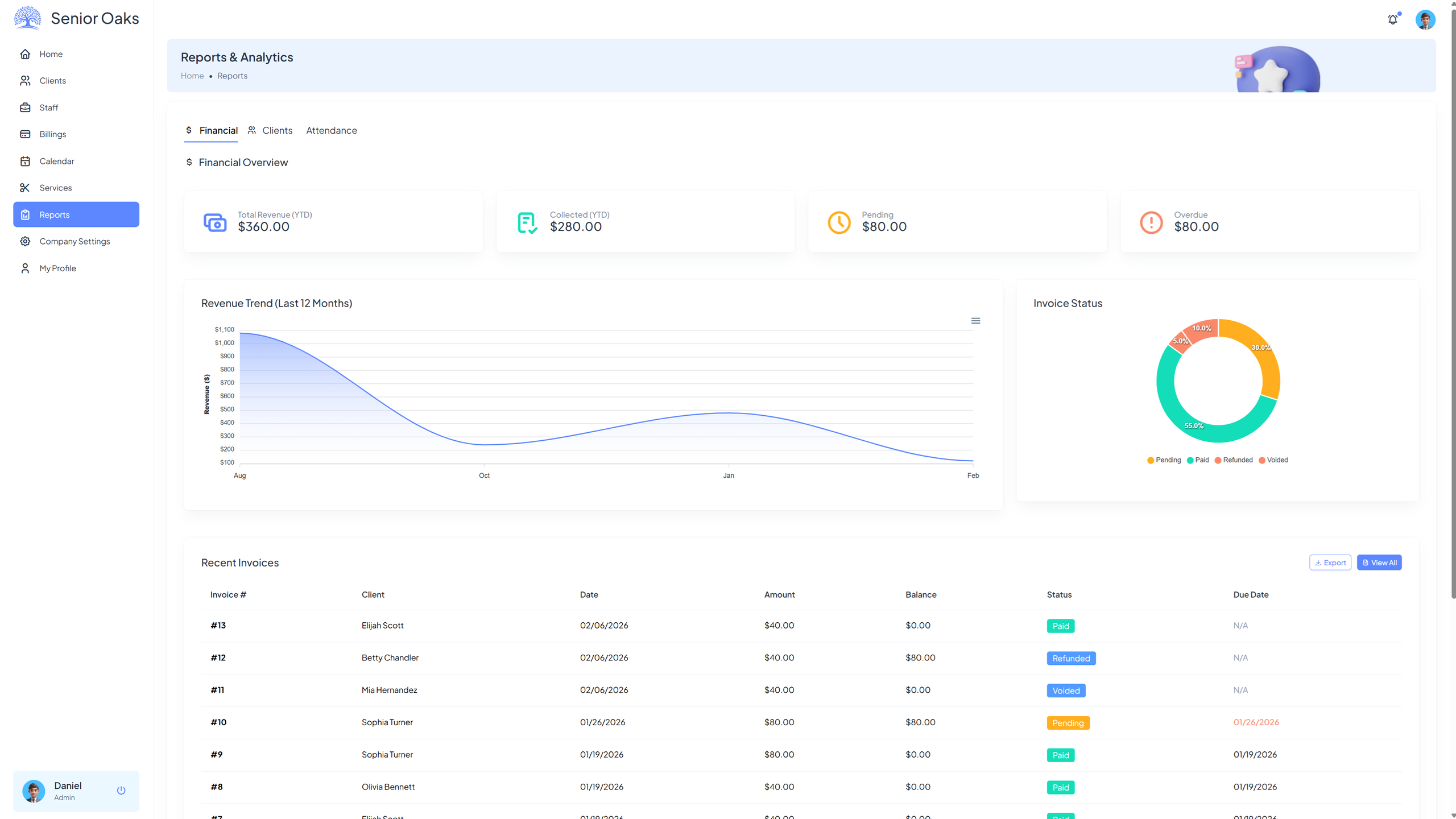 Senior Oaks LLC offers a free and modern solution for adult day care centers, including client management, attendance tracking, medical records, automated billing, online payments and much more. Automate your invoicing process and never miss a payment again with our intelligent billing system.