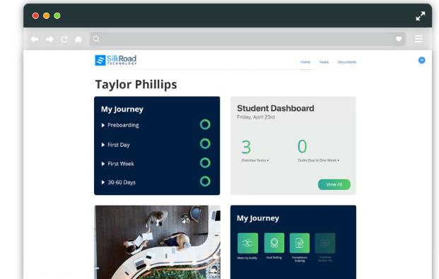 SilkRoad RedCarpet Onboarding helps companies of all sizes and complexities attract, retain and grow critical talent in a hyper-competitive market. We create streamlined, innovative, digital solutions that engage, align and empower employees to be successful today and in the future with experiences for every inflection point in the employee journey, including transfers or promotions, leaves of absence, mergers & acquisitions, offboarding and rehired employees. SilkRoad Technology solutions provide the foundation to improve talent and business performance. We’ll help you design tailored employee experiences and strengthen the connection to organizational strategy. SilkRoad empowers clients to provide clarity, alignment and enablement to employees, accelerating revenue and effectively managing costs and risks in the midst of workforce transformation. Provide insights and visibility to employees and managers throughout the onboarding journey to drive employee and manager productivity.