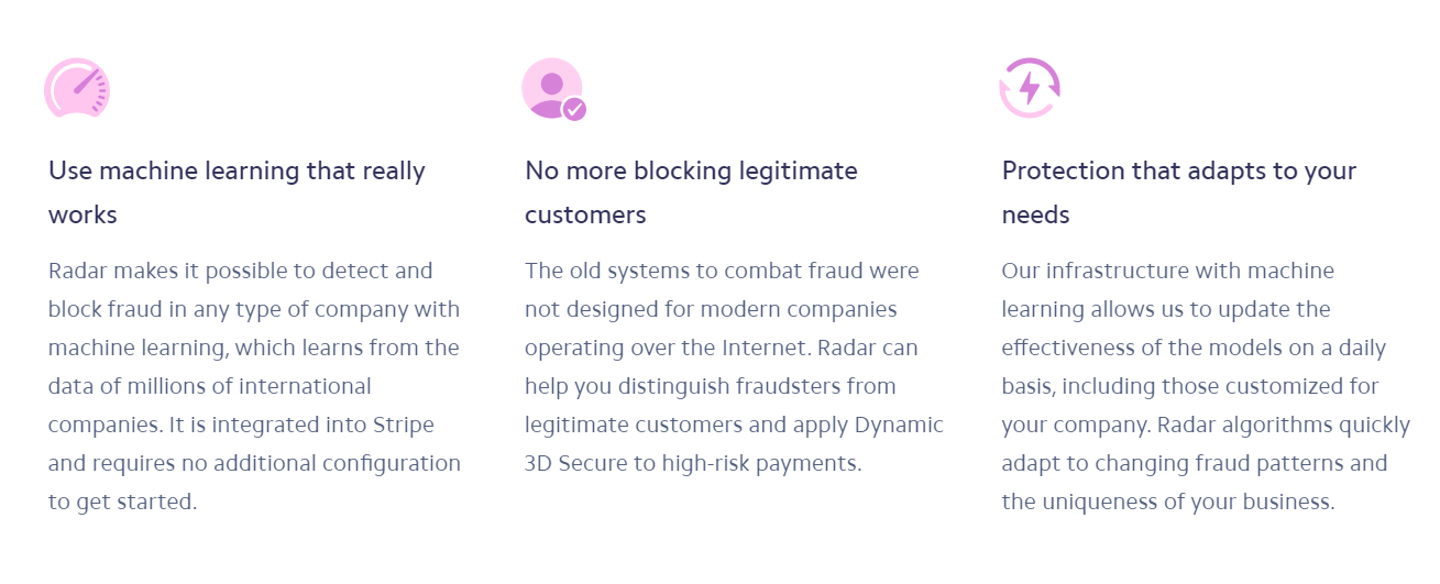 Fight fraud with the power of Stripe's network. Radar makes it possible to detect and block fraud in any type of company with machine learning, which learns from the data of millions of international companies. It is integrated into Stripe and requires no additional configuration to get started. The old systems to combat fraud were not designed for modern companies operating over the Internet. Radar can help you distinguish fraudsters from legitimate customers and apply Dynamic 3D Secure to high-risk payments. Our infrastructure with machine learning allows us to update the effectiveness of the models on a daily basis, including those customized for your company. Radar algorithms quickly adapt to changing fraud patterns and the uniqueness of your business. Stripe processes payments from 195 countries for companies of all sectors, sizes and business models. Even if a card is new to you, there is an 89% chance that it has already passed through the Stripe network.
