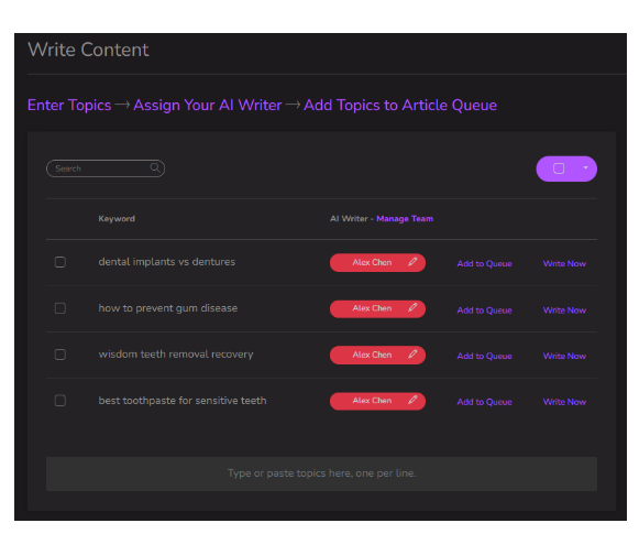 If you have no time to write content and learn SEO, Writio does this for you. Attract new customers and showcase your business online with Writio. Our tools are easy to use but built on powerful technology to bring real results to your business. Writio simplifies content marketing, helping you achieve these goals without the steep learning curve. Our AI-powered tools create tailored, SEO-optimized content that resonates with your target audience, saving you time and effort. Establish trust and authority in your industry. Customers will find you naturally through related content. Build relationships & trust by providing useful content that addresses your customers' needs. Guide interested leads to become paying customers through content marketing. Our experts have crafted Writio to create content that is not only authentic to your brand’s voice but fully optimized for the ever-changing landscape of SEO.
