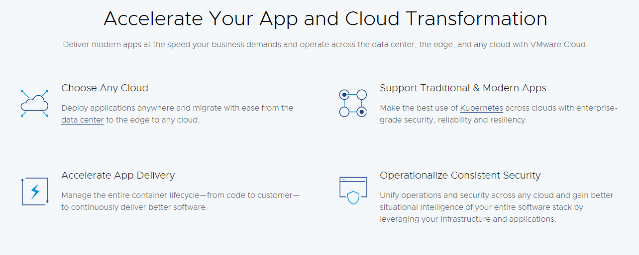 Build, run, manage, connect and protect all of your apps on any cloud. The Multi-Cloud solutions from VMware deliver a cloud operating model for all applications. Support your digital business initiatives with the world’s most proven and widely deployed cloud infrastructure. Leverage the same skills you use in the data center, while tapping into the depth and breadth of six global hyperscale public cloud providers and 4,000+ VMware Cloud Provider Partners. With hybrid cloud built on VMware Cloud Foundation, you get consistent infrastructure and operations for new and existing cloud native applications, from data center to cloud to edge. This consistency improves agility and reduces complexity, cost and risk. Build, run and manage modern apps on any cloud, meeting diverse needs with on-premises and public cloud resources. Manage both container-based workloads and traditional VM-based workloads on a single platform.