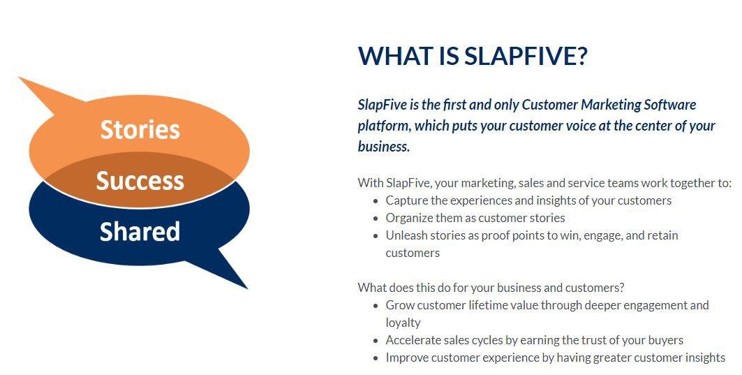 Easily capture your customer voice and infuse it into every aspect of your organization. Scale your Customer Marketing efforts and effectiveness without adding staff. Customers trust the opinions and experiences of peers and colleagues more than your marketing and sales messages. The most important thing B2B marketers can do to drive growth is generate happy, successful customers and unleash their voices and stories to earn trust and persuade buyers to take action. We call this Customer Marketing. SlapFive is the first and only Customer Marketing Software platform, which puts your customer voice at the center of your business. With SlapFive, your marketing, sales and service teams work together to capture the experiences and insights of your customers. organize them as customer stories, and unleash stories as proof points to win, engage, and retain customers. Grow customer lifetime value through deeper engagement and loyalty.