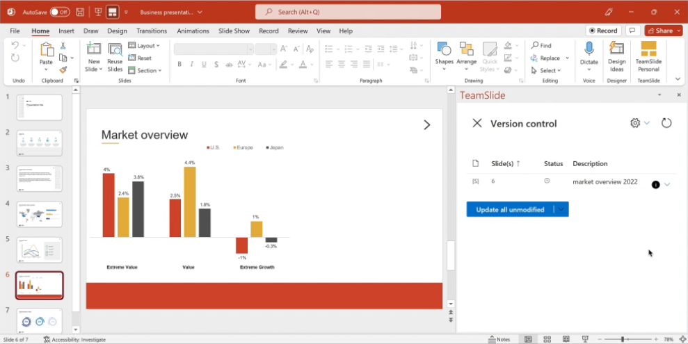 Have you ever wondered how some apps can manipulate PowerPoint files or even create slides automatically? For example, financial services organizations generate slides with updated numbers in an automated manner every month. At TeamSlide, we can automatically update out-of-date slides or even specific objects on a slide.