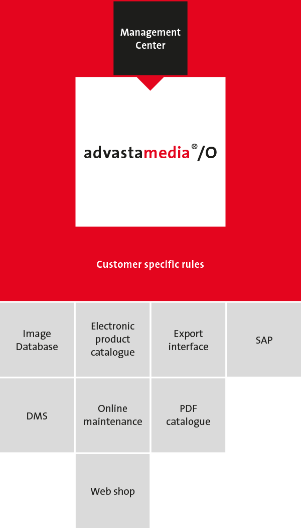 Based on our advastamedia®/O product media database, we have developed a powerful system in the sectors of Product Information Management (PIM), Media Asset Management (MAM) and Cross Media Publishing. All data and media relating to product, marketing, PR and sales are managed and processed and accordingly, advastamedia®/O supports numerous print and online publishing processes.