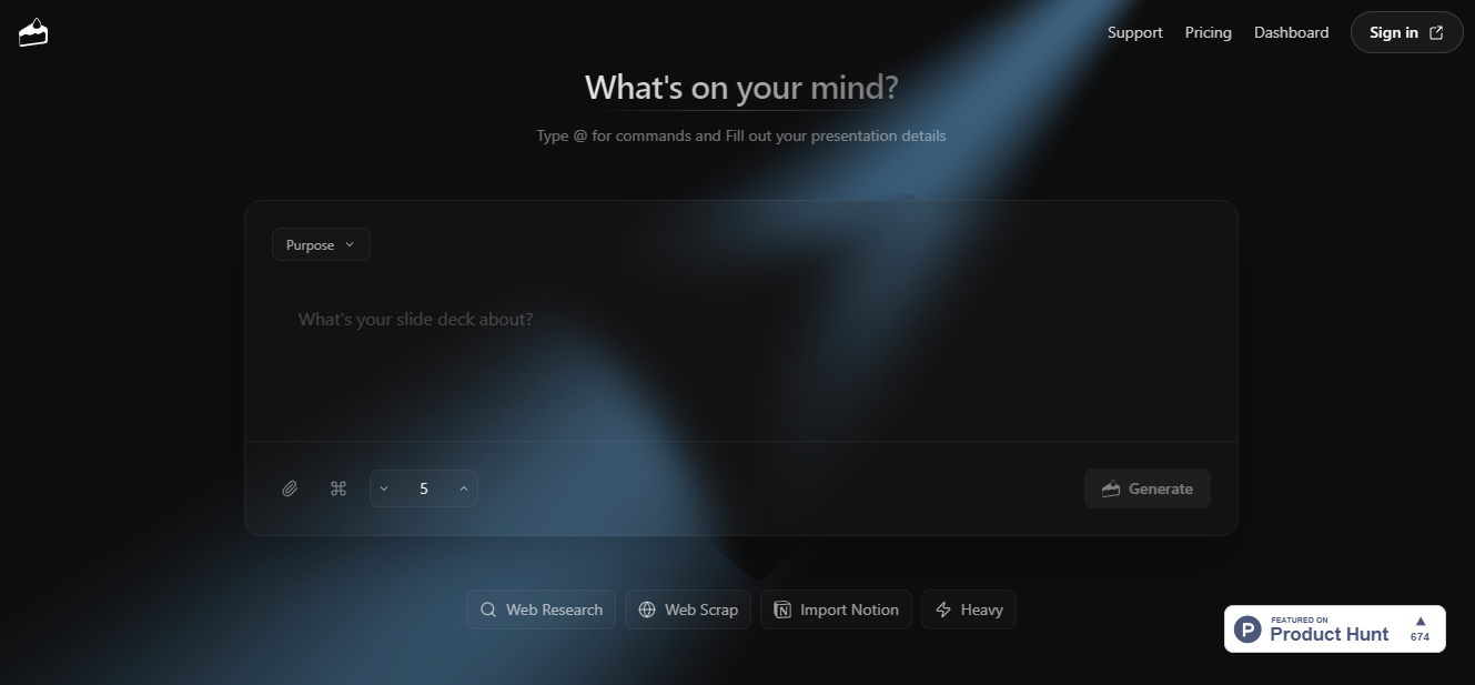 Snapdeck is a presentation-generation tool designed to make slide decks fast and easy. It lets you start with a prompt to take in your presentation details, then automatically pull in content from research, web scraping, or imported sources like Notion to build slides. It offers templates and tools so you stop fighting with PowerPoint or Keynote; instead, you focus on what you want to communicate, and Snapdeck handles layout, visuals, and populating content. It supports functions like web research, web scraping, and importing from Notion; there are controls for more elaborate content or design.