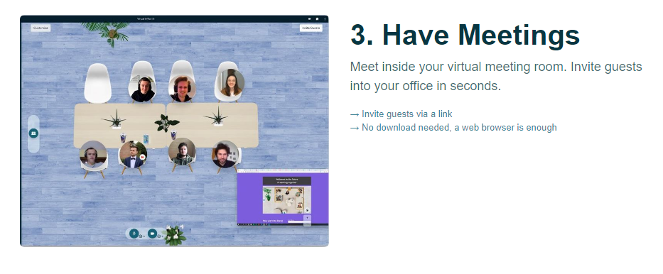 Join your new place using just your web browser. Place your own desks, chairs and walls so it feels like it's yours. Move around using arrow keys. You only hear and see people around you. Start your day with a quick Hi to everyone in the office. Unlike Zoom you keep it open for the full day. Meet inside your virtual meeting room. Invite guests into your office in seconds. Your remote people finally get their own desk in the office. Connect people across different physicial office locations. Get a new global office, located in the internet. Bring the in-person experience online, whether you're running a brainstorm, doing a retrospective or facilitating a workshop. In virtualoffice.team you only hear and see people around your bubble. Quickly join and leave conversations by moving around the hallway. Your presence accelerates communcation and improves trust across all your team mates.