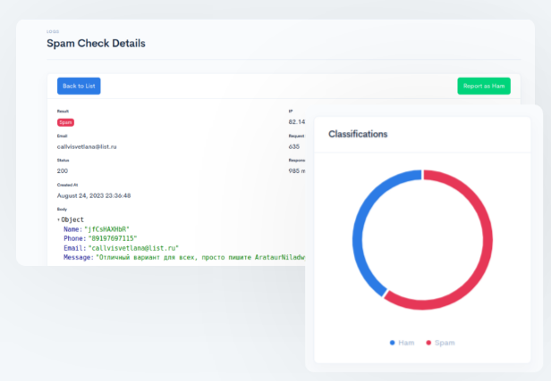 Built for SpamCheck-ing free form JSON, not emails like all the other spam APIs. Detect and block spam at the source with our extensive IP address analysis. Sophisticated analysis tools for detecting and assessing potential spam content. Validate and verify emails with our thorough multi-stage process. SpamCheckAI not only identifies and blocks spam but equips you with the comprehensive data needed to make informed decisions. Unleash the unparalleled power of SpamCheckAI’s URL Analysis, a revolutionary tool that digs deep to uncover hidden risks and elevates your platform’s integrity to new heights. Just pass the email and IP if you have them, then toss in any JSON object as the body. Whether you’ve got a handful of data or a whole heap, we’re all about flexibility. With SpamCheckAI, you’re in control, and spam doesn’t stand a chance. SpamCheckAI's API can analyze various content types including emails, IP addresses, and text content.
