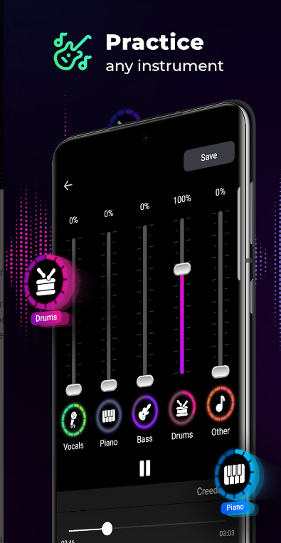 Use our state of the art voice removal method to make karaoke out of any song. Just upload any mp3 file and remove the vocals to make a quality backing track. Record yourself singing along and share with your friends. To get your singing more accurate, you can keep the original singer audible while recording and remove the vocals completely afterwards. With split you can boost more than just the bass. Get a new, better-than-equalizer listening experience. Play with the level of each instrument in real time, to listen to songs differently. Want to boost the drums? Listen to any song in acapella? Curious as to how your favorite songs would sound with just the vocals and drums active? Let your imagination run wild and choose your own unique listening experience. Use Sphereo’s split technology to remove or boost the instrument you’re playing for the perfect backing track. Make it as quiet or as loud as you need to best practice. Record yourself playing to see how much you’ve improved.