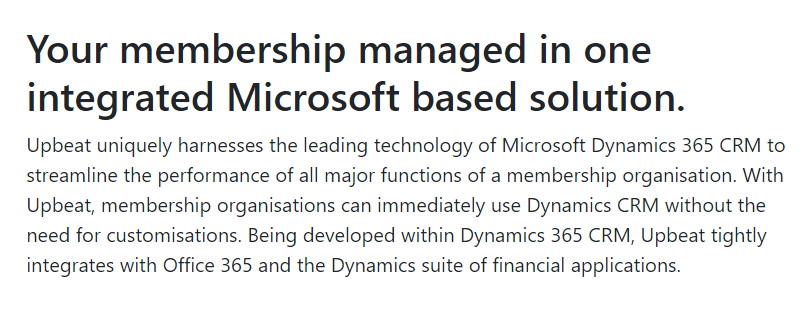 Upbeat Membership meets the system needs of forward-thinking membership-based organizations who seek to deliver an enhanced member experience with increased efficiency. A modern membership system meets this “do more with less” challenge by automating tasks, streamlining processes, and providing data-based insights that can drive action. Upbeat uniquely harnesses the leading technology of Microsoft Dynamics 365 CRM to streamline the performance of all major functions of a membership organization. With Upbeat, membership organizations can immediately use Dynamics CRM without the need for customizations. Being developed within Dynamics 365 CRM, Upbeat tightly integrates with Office 365 and the Dynamics suite of financial applications. Manage the entire Member life-cycle with ease from application and onboarding through to ongoing membership processes. Many regular processes such as renewals, payments, and deregistration, are automated to reduce time-consuming manual tasks.