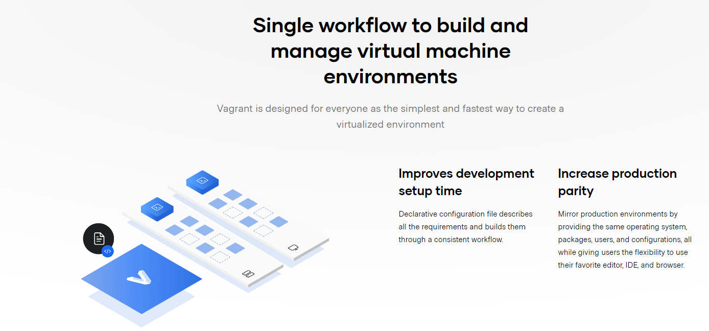 Vagrant is a tool for building and managing virtual machine environments in a single workflow. With an easy-to-use workflow and focus on automation, Vagrant lowers development environment setup time, increases production parity, and makes the "works on my machine" excuse a relic of the past. Mirror production environments by providing the same operating system, packages, users, and configurations, all while giving users the flexibility to use their favorite editor, IDE, and browser. Declarative configuration file describes all the requirements and builds them through a consistent workflow.