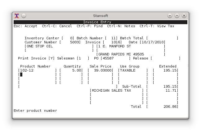 Stansoft is a Linux financial accounting software system for business. It is designed to be efficient for data entry with a text-based terminal interface based on ncurses. It is powered by Aubit 4GL or Informix 4GL using a PostgreSQL or Informix database engine. It is HMRC-recognised to process UK PAYE RTI Payroll and MTD VAT Returns. Included are the following modules: Payroll (U.S. and UK), Accounts Payable, Accounts Receivable, General Ledger, Tax Control, Sales, and Inventory. There are also fully integrated modules for petroleum marketers, wholesalers, and retail gas/petrol stations operators. These include Fuel Retail Sales, Fuel Management, and Fuel Dispatch. Demonstration videos can be found on the YouTube channel @standardsoftware.