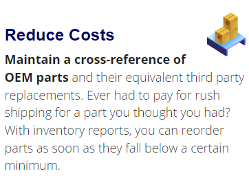 The Mechanic's Edge is the software you've been looking for to manage your shop more easily and efficiently. Digital Filing Cabinet: No more wasting time digging through invoices to find which supplier you called the last time you needed a hard-to-find part. With the Mechanic's Edge, you can easily type in a part number, and see all prior purchase information for that part. Maintain a cross-reference of OEM parts and their equivalent third party replacements. Ever had to pay for rush shipping for a part you thought you had? With inventory reports, you can reorder parts as soon as they fall below a certain minimum. Fewer errors: Fast work order entry for parts and automated service lists means less (error-prone) typing. Proactive maintenance scheduling helps you stay on top of your preventive maintenance programs to maximize machine up-time. Organization: The more organized your shop mechanic is, the more time he'll have to focus on the real work of maintaining your fleet.