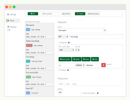 WireMock is a simulator for HTTP-based APIs. Some might consider it a service virtualization tool or a mock server. It enables you to stay productive when an API you depend on doesn't exist or isn't complete. It supports testing of edge cases and failure modes that the real API won't reliably produce. And because it's fast it can reduce your build time from hours down to minutes. MockLab is a hosted API simulator built on WireMock, with an intuitive web UI, team collaboration and nothing to install. The 100% compatible API supports drop-in replacement of the WireMock server with a single line of code. Run WireMock from within your Java application, JUnit test, Servlet container or as a standalone process. Match request URLs, methods, headers cookies and bodies using a wide variety of strategies. First class support for JSON and XML. Get up and running quickly by capturing traffic to and from an existing API.