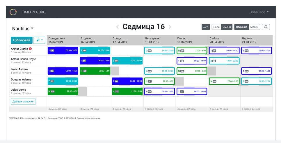 TIMEON.GURU is the solution that will help you optimize the work planning and reporting process. Everything is done with just a few clicks - creating and publishing shifts, preparing daily, weekly or monthly reports. No excels, no paper and no countless hours of processing. Automatically create a schedule with one click. Opportunity to independently enter work preferences. Always available online - by computer, tablet or phone. Extremely affordable price - up to BGN 2 per user per month. Intuitive interface and full settings. No time for implementation and training. You start working right away. our sites, projects or departments. Your shifts. Your rules. Your messages. You adjust TIMEON to the needs of your organization. TIMEON.GURU saves time spent in planning, coordination and communication. TIMEON.GURU is an amazingly easy to use software that everyone will love. People involved in planning and reporting will be fascinated by it.
