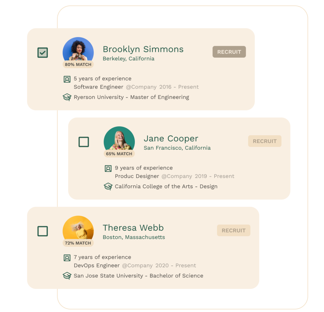 Find and engage with great talent. Whether it's passive sourcing, nurture and messaging, or referrals, we help companies hire the right people for their team. Accelerate how quickly you can find candidates, across all roles. Our integrated software and data platform helps recruiters and managers hire together, at scale. Grow relationships beyond templated outreach, and build excitement around your mission and vision. Our experts can quickly and effectively work as a natural extension of your team and help eliminate costly RPO and agency spend. We also built sourcing software that leaves the competition behind. Teamable streamlines Referrals, Inbound, and Outbound. Let us help you find people in your network, or add amazing new people to it.
