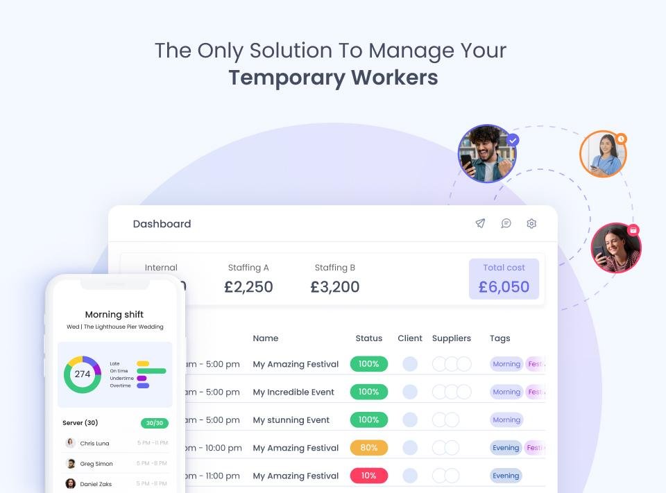 The ultimate staffing platform for temporary and shift work. Offering an end-to-end solution for staffing/recruitment agencies, stadium event management and businesses employing temp workers.