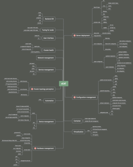 xCAT (Extreme Cloud Administration Toolkit) is an open source tool designed to automate the deployment, scaling, and management of bare metal servers and virtual machines. It offers comprehensive management capabilities for high-performance computing clusters, render farms, grids, web farms, online gaming infrastructures, clouds, and data centers. xCAT provides an extensible framework based on years of system administration best practices, enabling administrators to discover hardware servers, execute remote system management, provision operating systems on physical or virtual machines in both disk and diskless modes, install and configure user applications, and perform parallel system management. The toolkit supports various operating systems, including Red Hat, Ubuntu, SUSE, and CentOS, and is compatible with architectures such as ppc64le, x86_64, and ppc64. It integrates with management protocols like IPMI, HMC, FSP, and OpenBMC, facilitating remote console access.