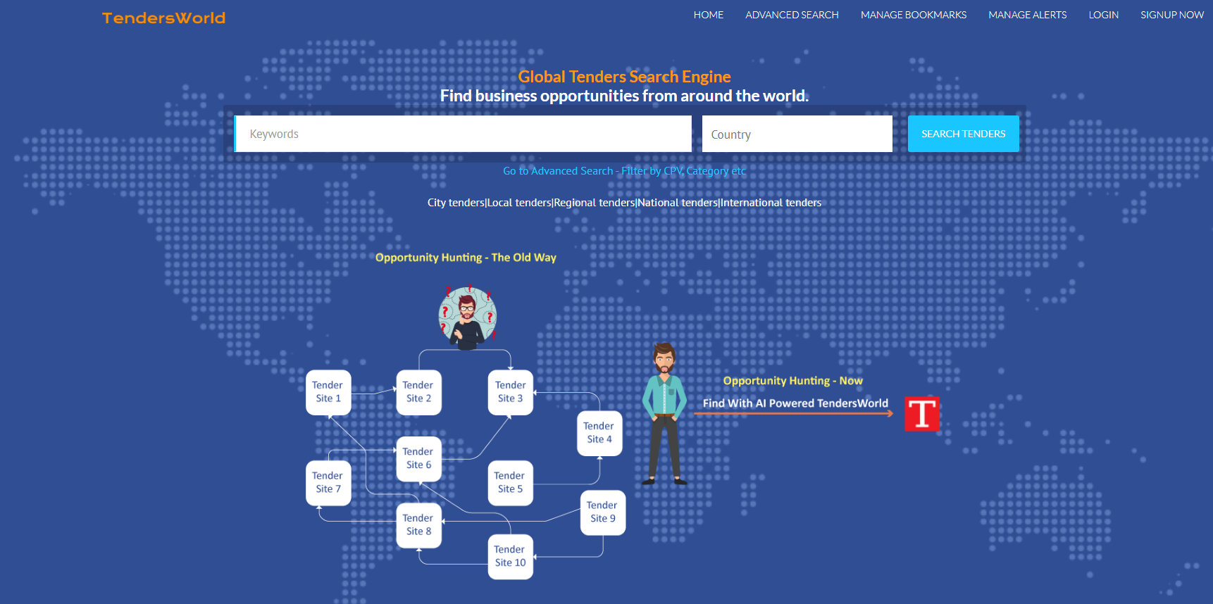 Tendersworld is a global tenders search engine powered with AI. Find tenders and business opportunities including RFPs and RFQs that are international, national, regional, local and from your city. Avoid searching hundreds of tender sites as a single search will bring all results in one place. Get alerts about tenders and bookmark your favourite ones!