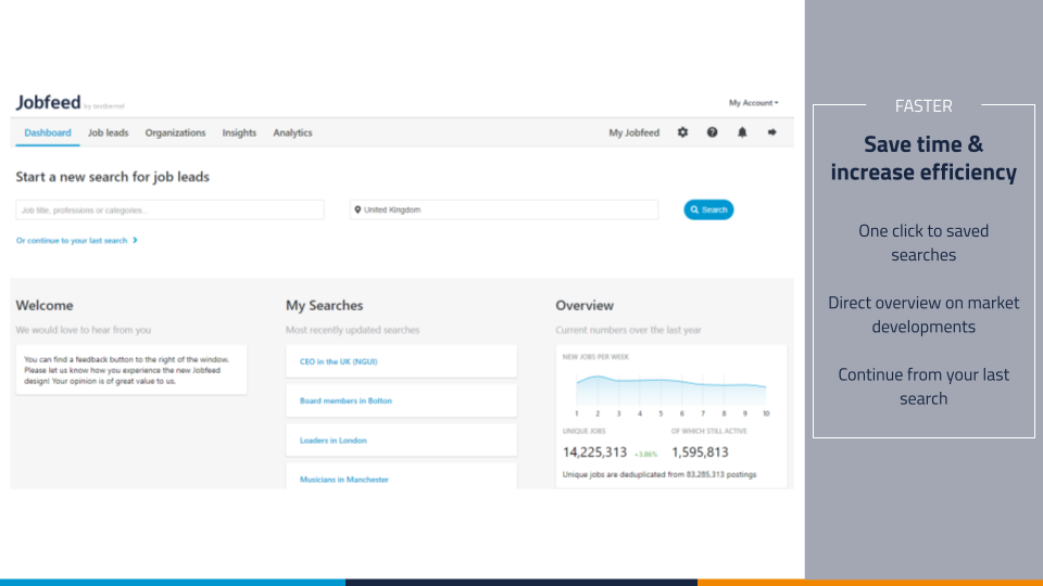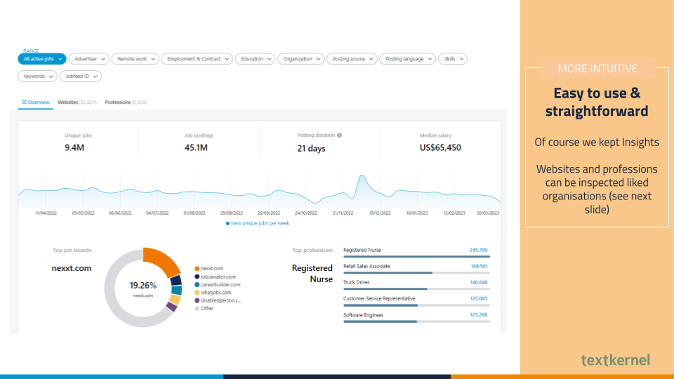 In today’s highly competitive labor market, leveraging advanced data tools delivers the edge. Textkernel’s Labor Market Insights provides access to the largest job database, containing over 3 billion current and historical job postings from over 33 million websites. Plus our ability to structure and enrich an organization’s private data allows for analyzing talent data in the context of market demand.