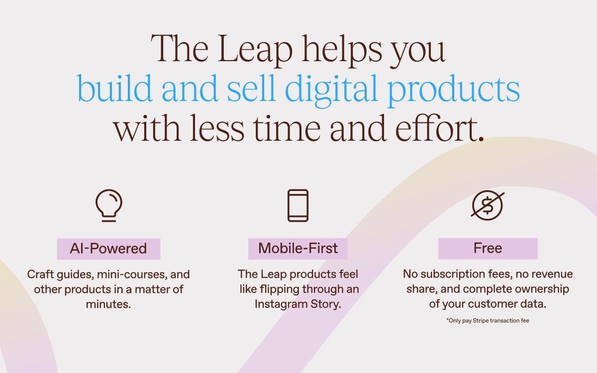 Build and sell digital products in minutes with our free, AI-powered platform. with everything you need to launch your online business in a single end-to-end platform. Our AI-powered product builder removes the second-guessing when it comes to creating your products. Just tell The Leap what you’re good at and watch the magic happen. Sales pages are instantly generated for the products you create on The Leap. Links to these pages are automatically added to your customizable link in the bio storefront and can be shared anywhere. Once a transaction is completed, we’ll automatically send the customer a unique access link to your product. Links expire after time to protect your intellectual property and can only be re-authenticated by the purchaser.